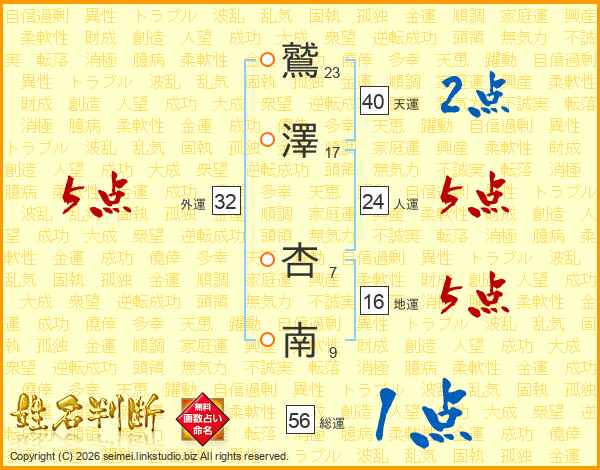 鷲澤杏南さんの総運は56画の1点!