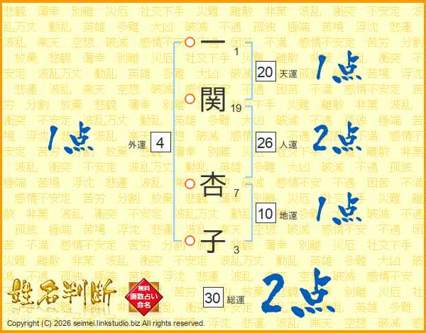 一(1画)関(19画) 杏(7画)子(3画)