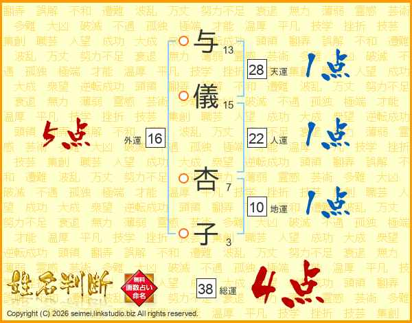 画数の奇数(○陽)と偶数(●陰)の配列で吉凶を占います。どちらかにかたよる名前は大凶名で避ける必要があります。画数の奇数偶数。