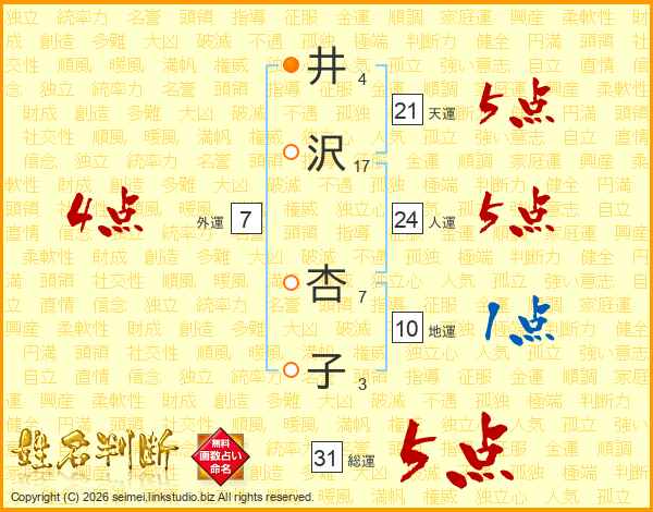 井(4画)沢(17画) 杏(7画)子(3画)