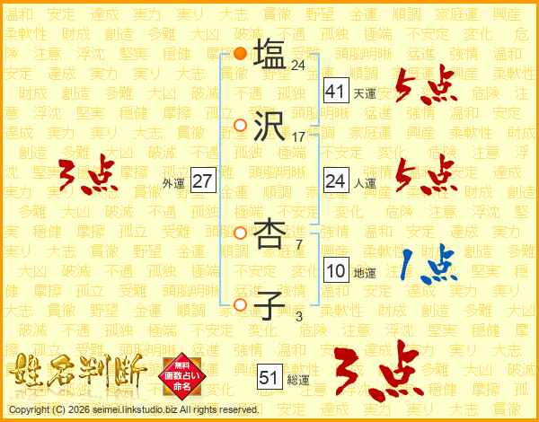 塩(24画)沢(17画) 杏(7画)子(3画)