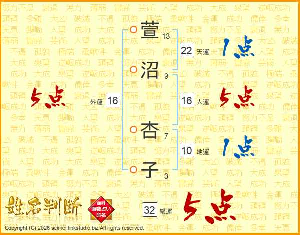 萱沼杏子さんの総運は32画の5点!
