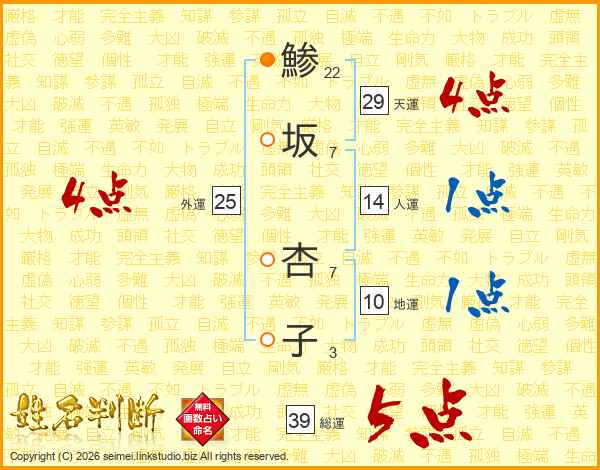 鯵坂杏子さんの総運は39画の5点!