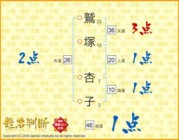 鷲(23画)塚(13画) 杏(7画)子(3画)