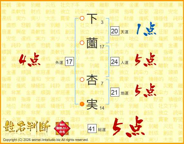 生活面を象徴する運勢です。外部から受ける影響力を表し、結婚運、家庭運や職場、環境への順応性を表します。総運から人運を引いた画数。姓や名が1文字の場合を除く。