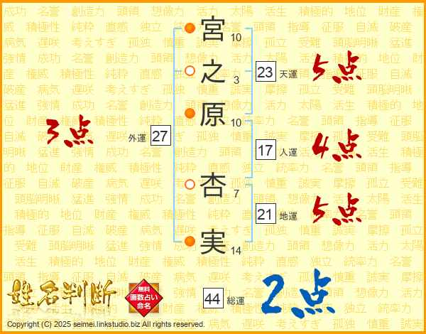 宮(10画)之(3画)原(10画) 杏(7画)実(14画)