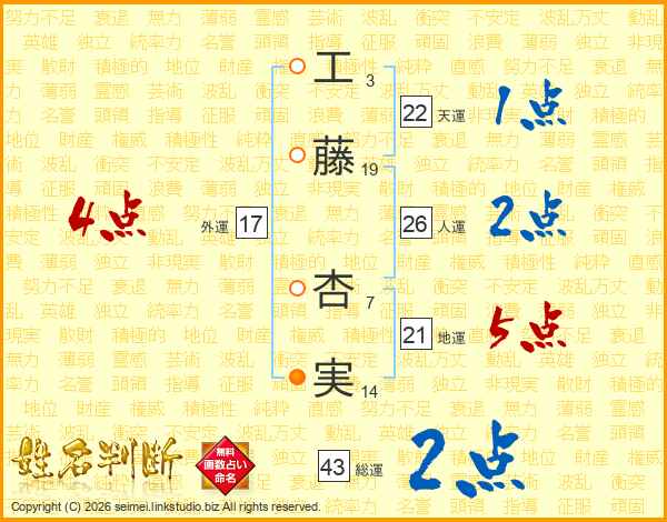 生活面を象徴する運勢です。外部から受ける影響力を表し、結婚運、家庭運や職場、環境への順応性を表します。総運から人運を引いた画数。姓や名が1文字の場合を除く。