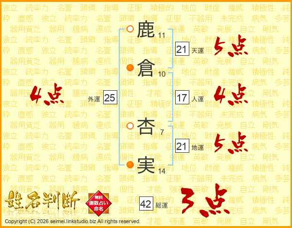 鹿(11画)倉(10画) 杏(7画)実(14画)