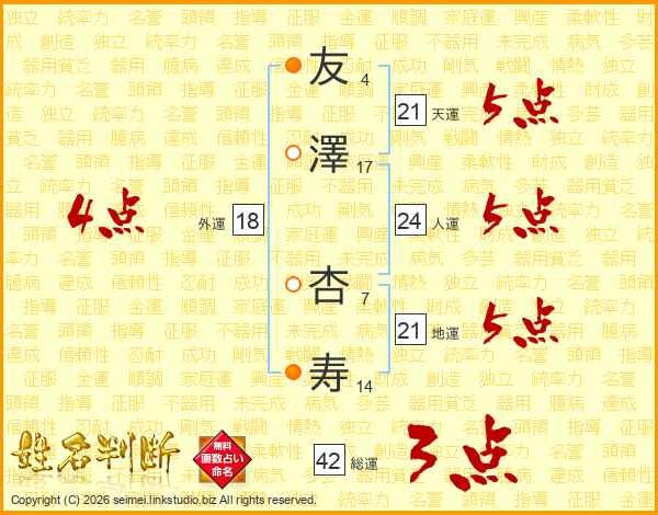 友澤杏寿さんの天運は21画の5点!