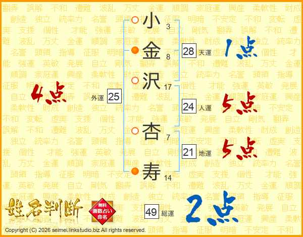 小(3画)金(8画)沢(17画) 杏(7画)寿(14画)