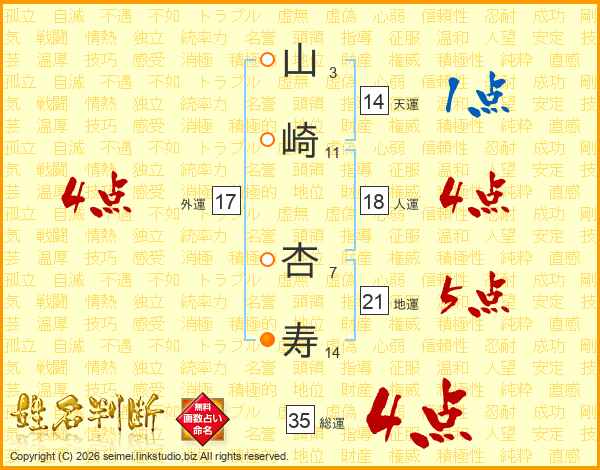 山(3画)崎(11画) 杏(7画)寿(14画)