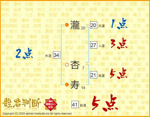 家系が持つ宿命的な運勢を表します。祖先から受け継いだ苗字ですので自分の力が及びません。家柄を象徴します。苗字の合計画数。