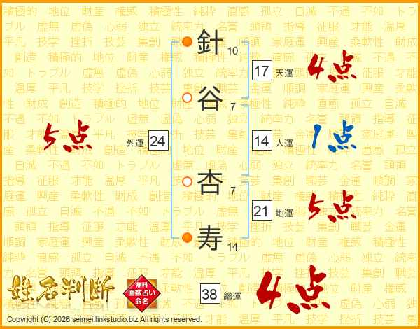 針(10画)谷(7画) 杏(7画)寿(14画)