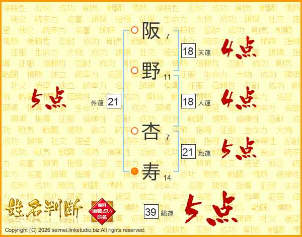 阪野杏寿さんの総運は39画の5点!