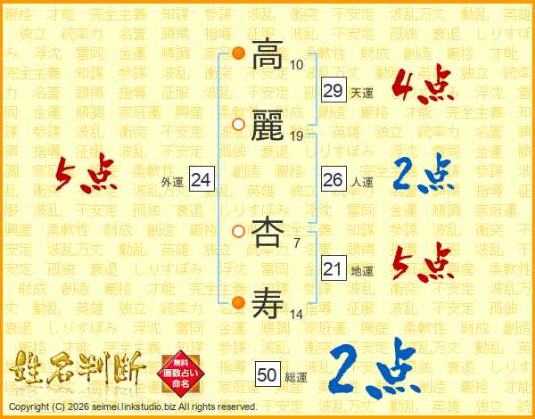 高(10画)麗(19画) 杏(7画)寿(14画)
