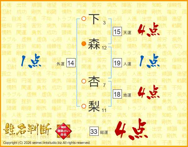 生活面を象徴する運勢です。外部から受ける影響力を表し、結婚運、家庭運や職場、環境への順応性を表します。総運から人運を引いた画数。姓や名が1文字の場合を除く。