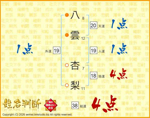 八雲杏梨さんの総運は38画の4点!