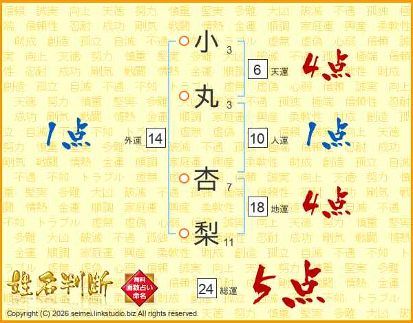 生活面を象徴する運勢です。外部から受ける影響力を表し、結婚運、家庭運や職場、環境への順応性を表します。総運から人運を引いた画数。姓や名が1文字の場合を除く。