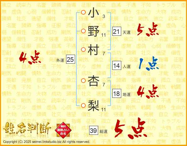 小(3画)野(11画)村(7画) 杏(7画)梨(11画)