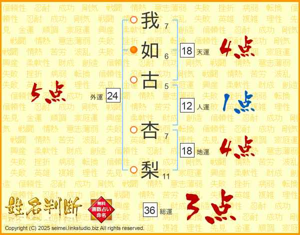 あなたの人生を表す1番重要な運勢です。生涯を通じて影響する総合運となり、主に50歳以降の晩年期に影響を及ぼします。苗字と名前の合計画数。
