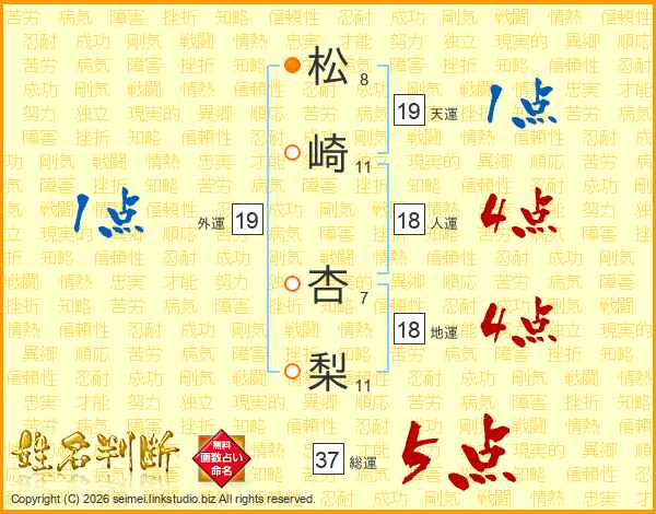 松(8画)崎(11画) 杏(7画)梨(11画)