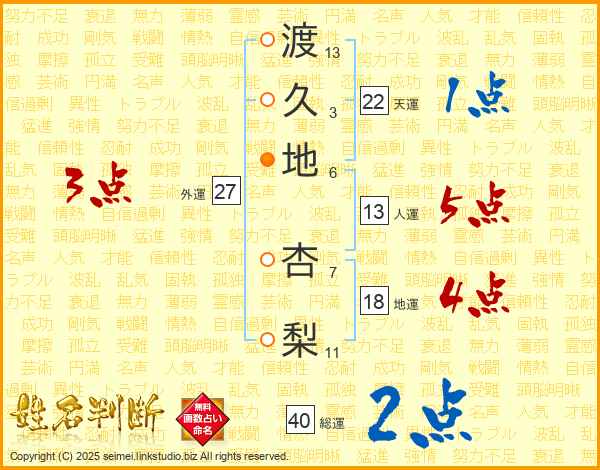 渡(13画)久(3画)地(6画) 杏(7画)梨(11画)