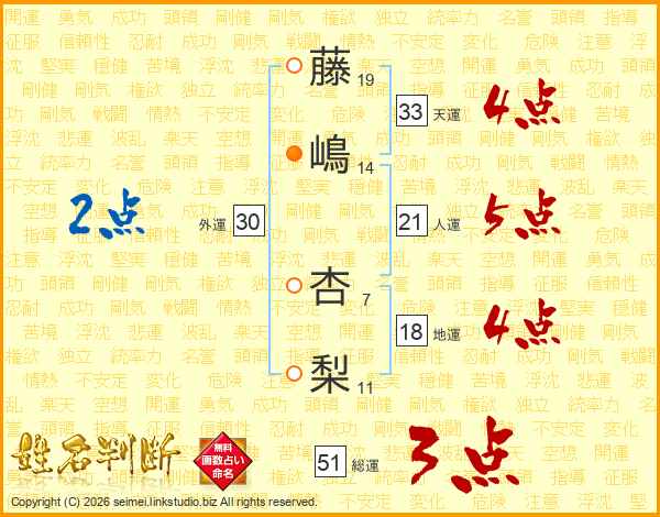藤(19画)嶋(14画) 杏(7画)梨(11画)