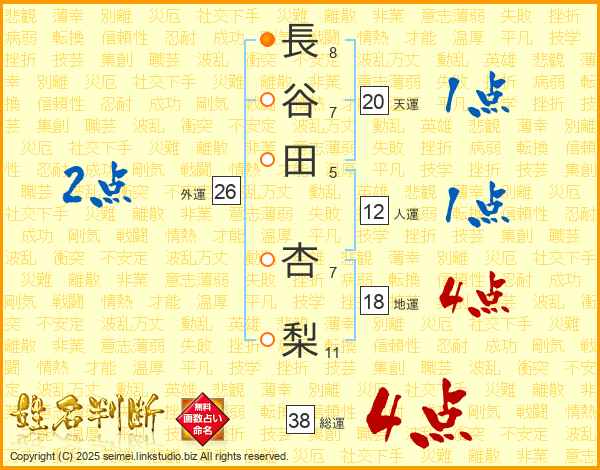 長(8画)谷(7画)田(5画) 杏(7画)梨(11画)
