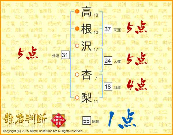 高(10画)根(10画)沢(17画) 杏(7画)梨(11画)