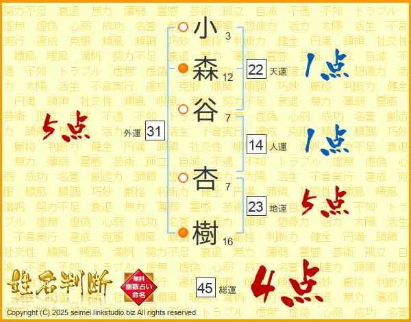 小(3画)森(12画)谷(7画) 杏(7画)樹(16画)