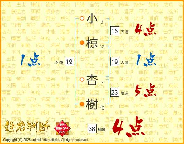 小(3画)椋(12画) 杏(7画)樹(16画)