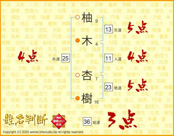 柚(9画)木(4画) 杏(7画)樹(16画)