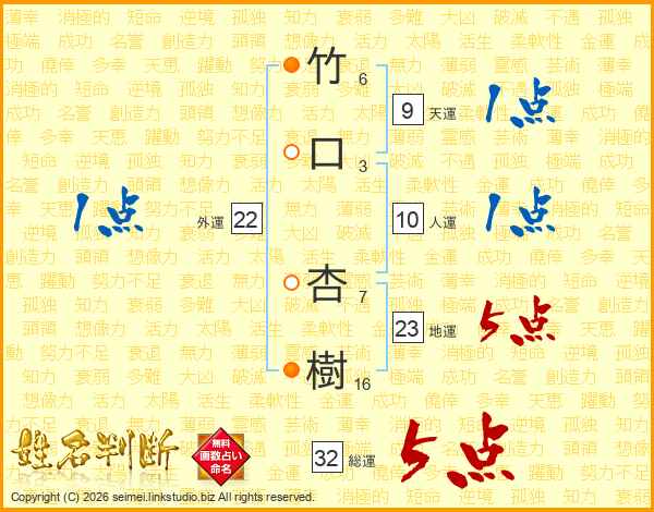 竹口杏樹さんの総運は32画の5点!
