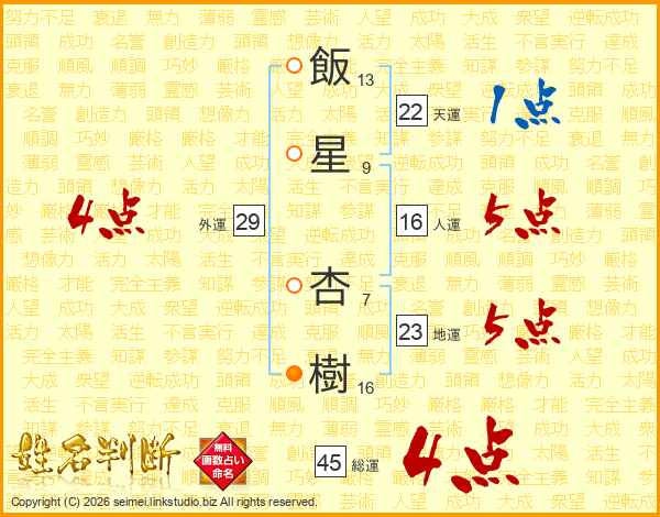 飯星杏樹さんの総運は45画の4点!