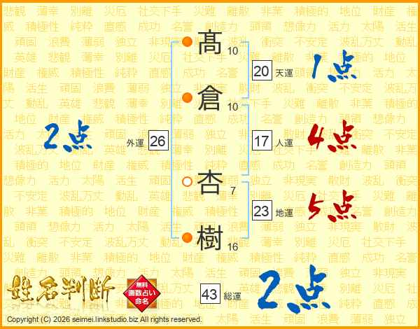 髙倉杏樹さんの総運は43画の2点!