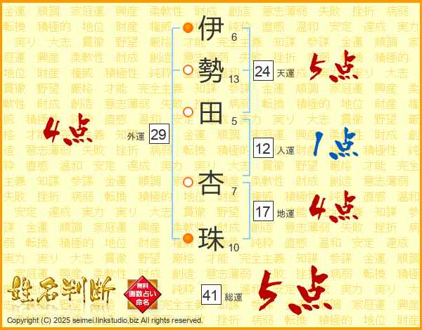 伊(6画)勢(13画)田(5画) 杏(7画)珠(10画)