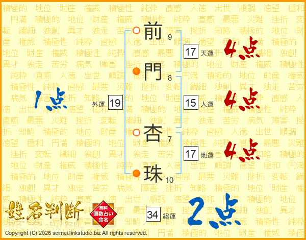 前門杏珠さんの総運は34画の2点!