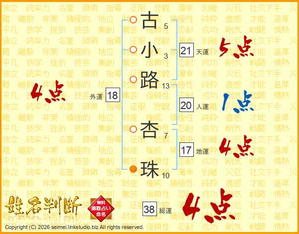 古小路杏珠さんの総運は38画の4点!