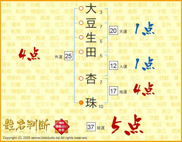 大(3画)豆(7画)生(5画)田(5画) 杏(7画)珠(10画)