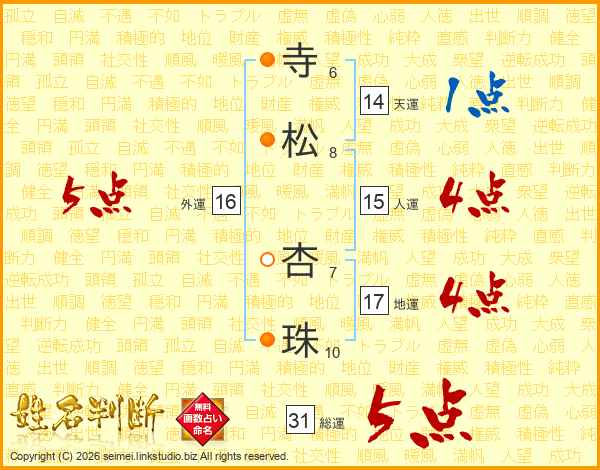 寺松杏珠さんの総運は31画の5点!