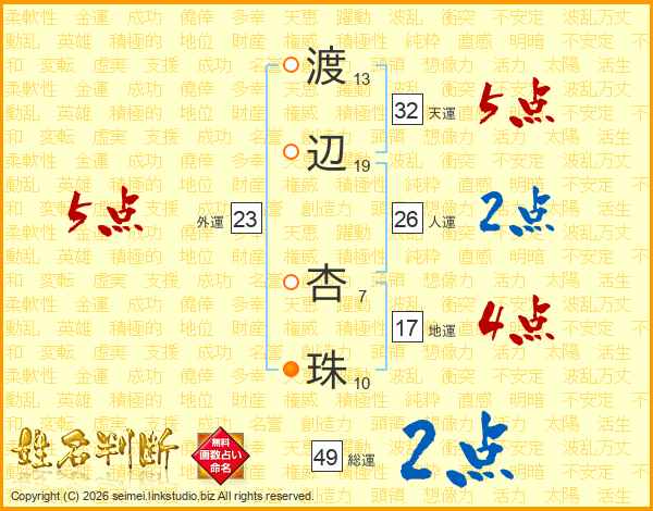 渡(13画)辺(19画) 杏(7画)珠(10画)