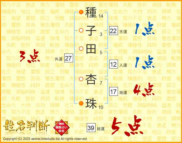 種(14画)子(3画)田(5画) 杏(7画)珠(10画)
