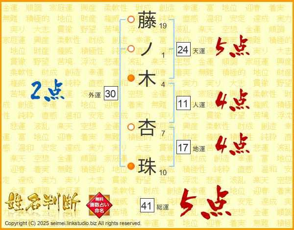 藤(19画)ノ(1画)木(4画) 杏(7画)珠(10画)
