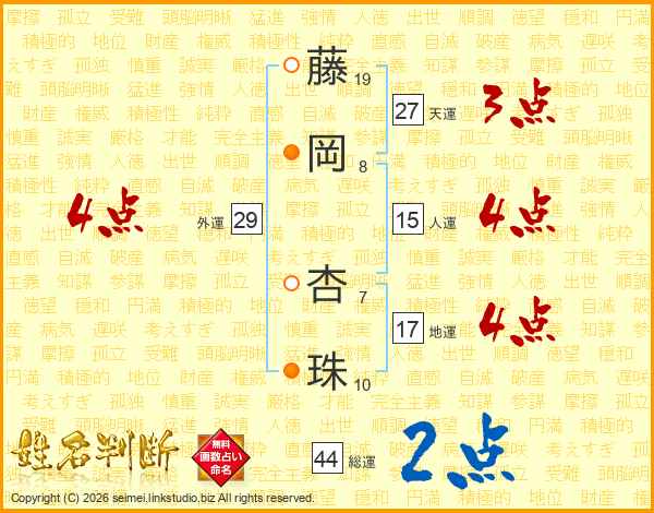 藤(19画)岡(8画) 杏(7画)珠(10画)