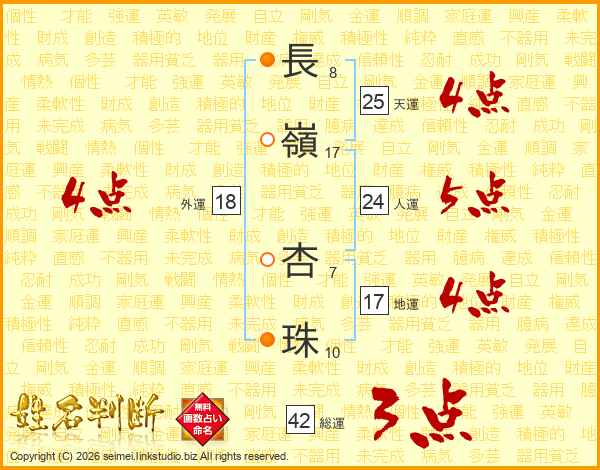 長(8画)嶺(17画) 杏(7画)珠(10画)