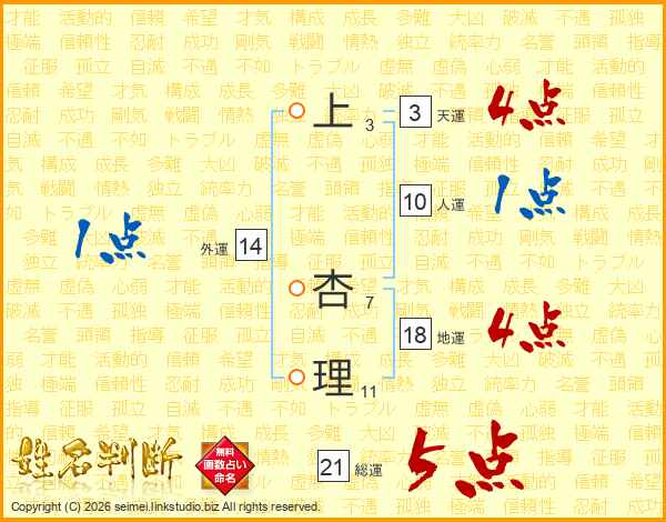 生活面を象徴する運勢です。外部から受ける影響力を表し、結婚運、家庭運や職場、環境への順応性を表します。総運から人運を引いた画数。姓や名が1文字の場合を除く。