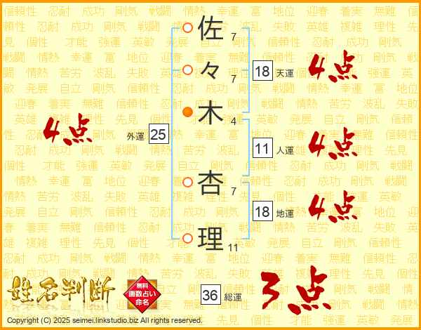 佐(7画)々(7画)木(4画) 杏(7画)理(11画)
