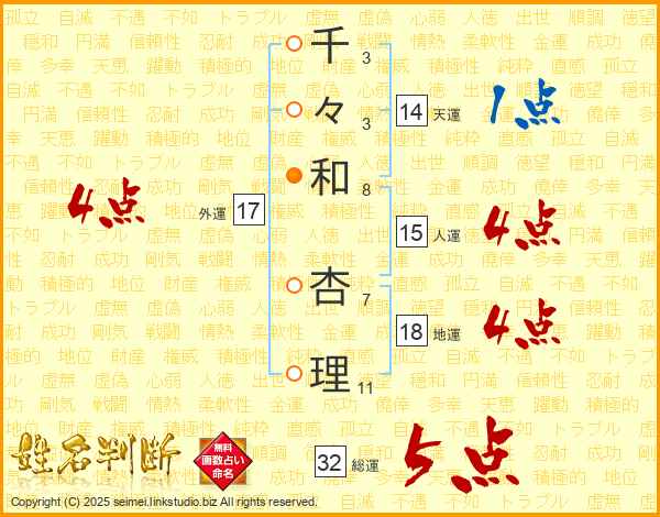 千(3画)々(3画)和(8画) 杏(7画)理(11画)