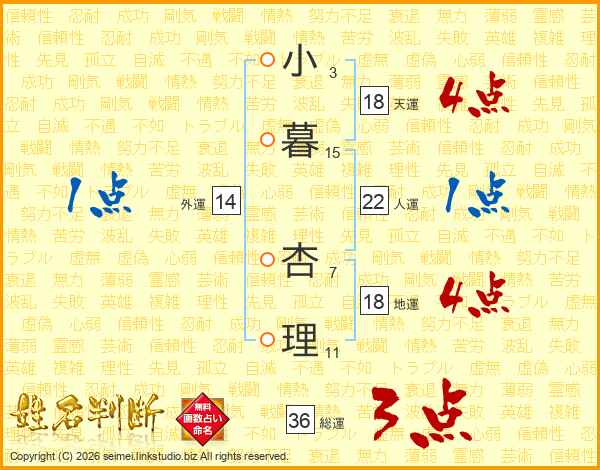 生活面を象徴する運勢です。外部から受ける影響力を表し、結婚運、家庭運や職場、環境への順応性を表します。総運から人運を引いた画数。姓や名が1文字の場合を除く。