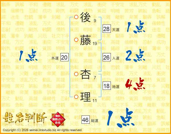 生活面を象徴する運勢です。外部から受ける影響力を表し、結婚運、家庭運や職場、環境への順応性を表します。総運から人運を引いた画数。姓や名が1文字の場合を除く。